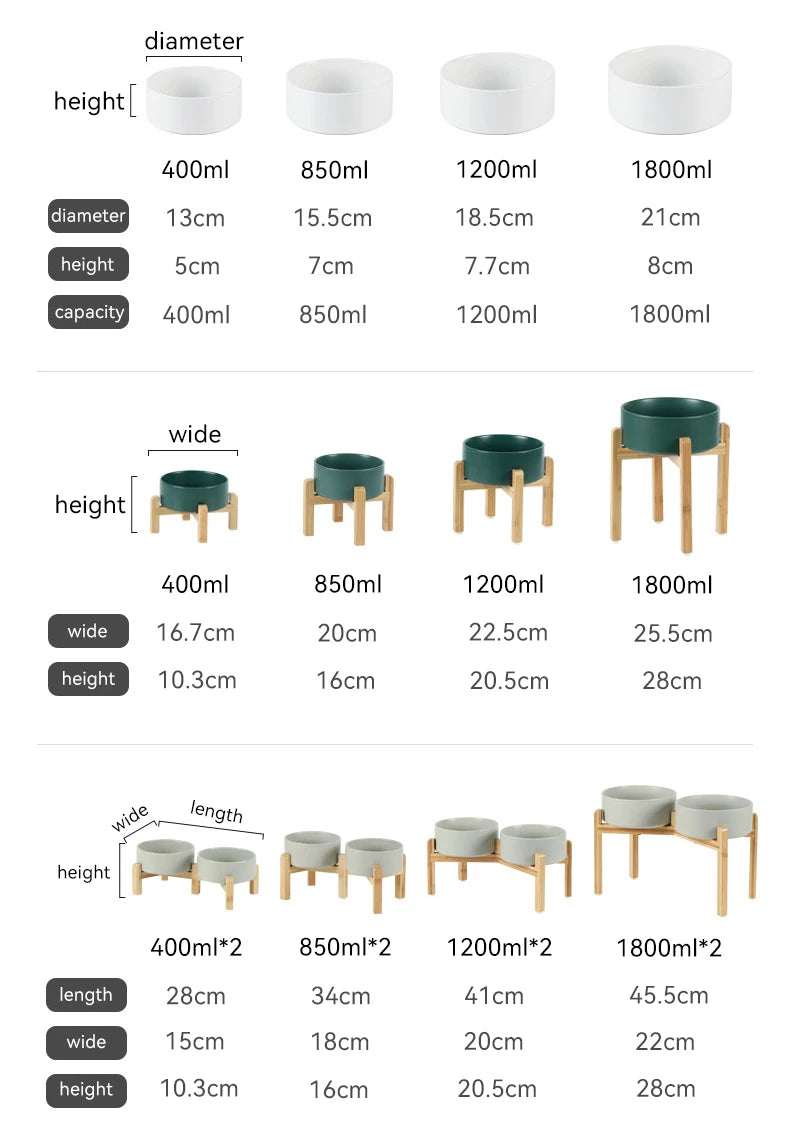 Available in multiple sizes – 400ml, 800ml, 1200ml, and 1800ml – to suit puppies, adult dogs, and even larger breeds, making it perfect for dry food, wet food, or water.